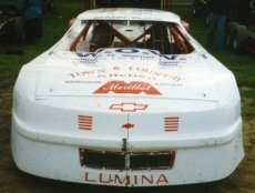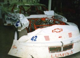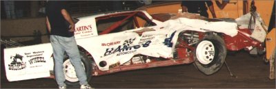 1996- Yes, accidents do happen. With just 3 weeks to go in the 1996 season we had the worst crash in our six years of racing. I was running 4th and in the process of passing the 2nd and 3rd place cars on the outside when they got together and both headed for the wall. I basically was in the wrong place at the wrong time and buffered their blow to the wall. One hit me in the left rear wheel and the other in the left front wheel. This drilled the right side of the car into the wall and you can see the damage. The car that hit the front went airborne and landed across my engine compartment (the fiberglass hood was gone!) Luckily his car rested on the cage and straddled the engine, no damage to the engine. The frame horns were moved over 6 inches and badly twisted. We had to replace the frame horns and all the tubing under the hood! The front suspension had to be replaced as you can see part of the spindle still attached to the tie rod in front of the front wheel.